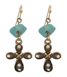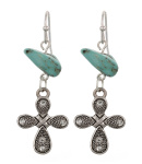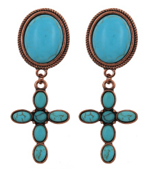 ![]() ![]() Cross Turquoise Dangle Earring Set Width x Length : 3/4" x 2" Material : Metal, Stone Metal Color : Worn Copper
