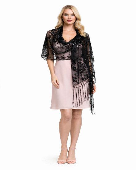 Sequined Shawl: Floral Size : 22" X 61" + 6" F Item Material : 80% Polyester, 20% Plastic Item Color : BLACK