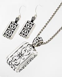 ![]() ![]() Filigree Metal Pendant Necklace & Earring Set Length : 15 1/4" + EXT Pendant : 7/16" X 5/8" Earring : 7/16" X 1"